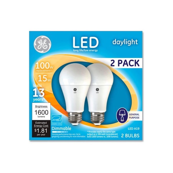 100W Led Bulbs, 15 W, A19, Daylight, 2/Pack