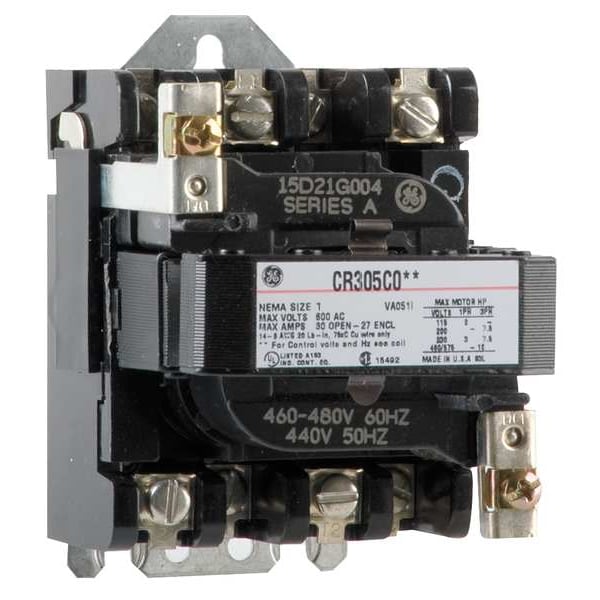 NEMA Magnetic Contactor, Auxiliary Contact Form 1NO, NEMA Enclosure Rating No Enclosure, NEMA Size 1, Coil Voltage 480V AC, Number of Poles 3, Full Load Current - Inductive 27 A, Reversing Capability Non-Reversing, Overall Height 3.94 in, Overall Width 3.06 in, Series CR305, Number of Auxillary Contacts 1, Contactor Style NEMA, Horsepower @ Three Phase - 240V AC 7 1/2 hp, Horsepower @ Three Phase - 480V AC 10 hp, Phase Three, Horsepower @ Three Phase - 600V AC 10 hp