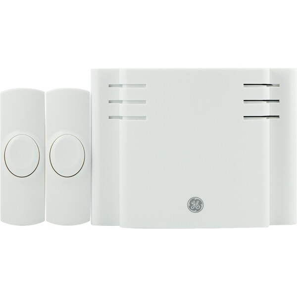 The GE Eight-Chime, Two-Push Button Wireless Door Chime provides a do-it-yourself project for a home or office. Program individual sounds for multiple doors using up to four battery-operated push buttons. Customize your chime volume using the low/medium/high volume adjustment feature. Simply install batteries in the chime and two push buttons, and you're ready to go!