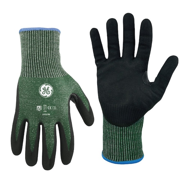 GE Medium 15ga Micro Foam Nitrile Dipped Glove 12 Pairs. This is a GE Cut Resistant Micro Foam Nitrile Dipped Glove with a 15 Gauge HPPE, Glass Fiber, Polyester, Spandex Liner and a Black Micro Foam Nitrile Coating. The coating provides good grip when used with light oils 12 Pack. It meets EN388:2016- 4331B Standard and has CE certification.