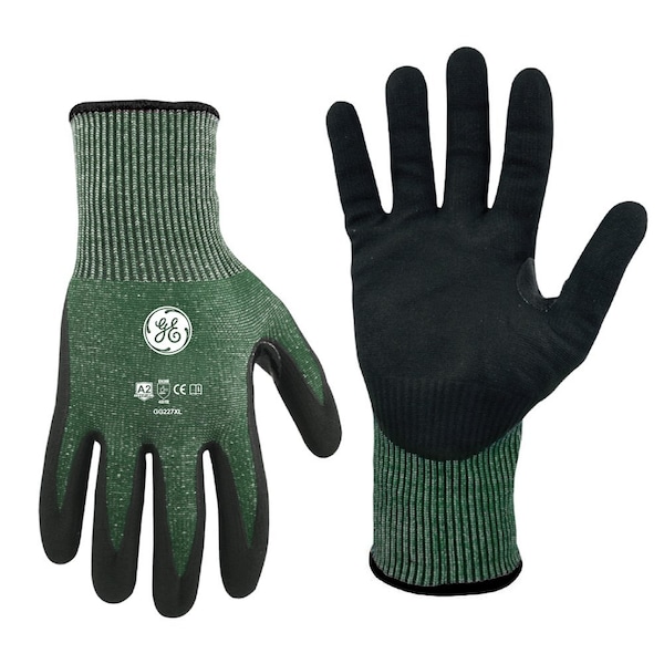 GE Extra Large 15ga Micro Foam Nitrile Dipped Glove 12 Pairs. This is a GE Cut Resistant Micro Foam Nitrile Dipped Glove with a 15 Gauge HPPE, Glass Fiber, Polyester, Spandex Liner and a Black Micro Foam Nitrile Coating. The coating provides good grip when used with light oils 12 Pack. It meets EN388:2016- 4331B Standard and has CE certification.