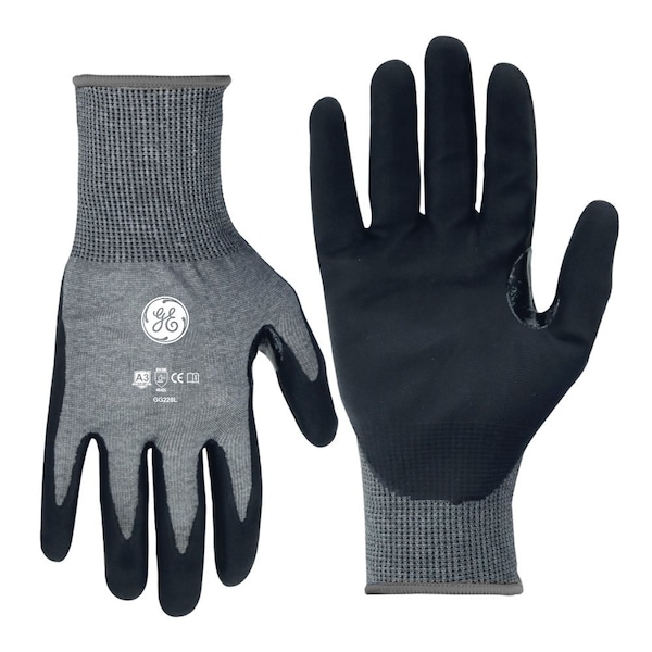 GE Large Large 15ga Micro Foam Nitrile Dipped Glove 12 Pairs. This is a GE Cut Resistant Micro Foam Nitrile Dipped Glove with a 15 Gauge HPPE, Glass Fiber, Polyester, Spandex Liner and a Black Micro Foam Nitrile Coating. The coating provides good grip when used with light oils 12 Pack. It meets EN388:2016- 4X42C Standard and has CE certification.