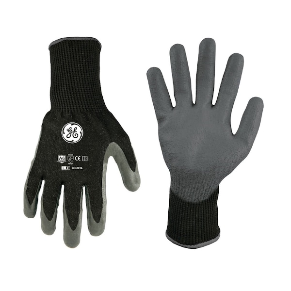 GE Large 13ga Pu Dipped Cut Resistant Level 6 Glove 12 Pairs. This is a GE PU Dipped Cut Resistant Level 6 Glove with a 13 Gauge HPPE, Steel, Glass Fiber and Polyester Liner and a Gray Polyurethane Coating 12 Pack. It has a longer cuff for better protection and comfort. It meets EN388-4X42F Standard and has CE certification.