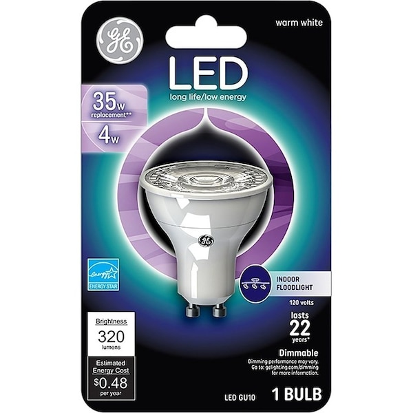 GE Floodlight Bulb, Wattage Rating: 3.7 W, Lamp Base: GU10, Lamp Shape: MR16, Lamp Finish: White, Lumens: 260 Lumens, Dimmable: Dimmable, Light Color: Bright White, Color Temperature: 3000 K, Color Rendering Index CRI: 80, Average Life: 25,000 hr, Beam Angle: 20 deg, Incandescent Equivalent: 35 W, Beam Spread: Narrow