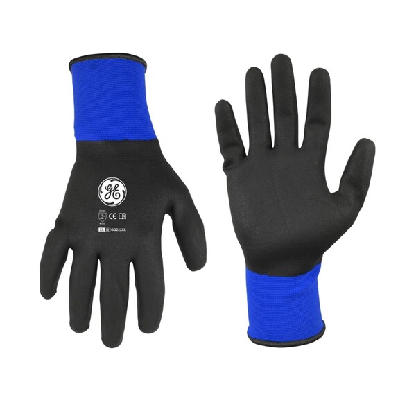 GE Extra Large 15ga Fully Dipped Foam Nitrile Glove 12 Pairs. This is a GE Fully Dipped Foam Nitrile Glove with a 15 Gauge Polyester and Spandex Liner and a Black Foam Nitrile Coating 12 Pack. It is compatible with light oils. It meets EN388:2016 4131X Standard and has CE certification.