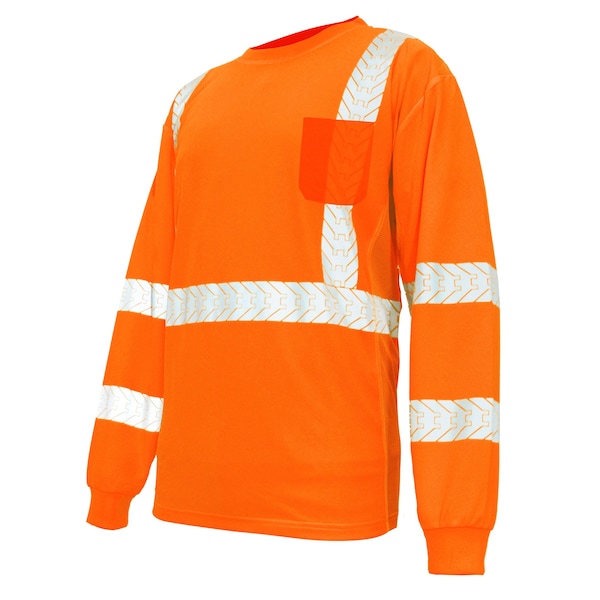 GE ANSI Class 2 Type R Safety Orange Hi-Vis Long Sleeve Shirt Large. This is a GE Orange Hi-Vis Shirt with birdseye knit polyester fabric, round neck, long sleeve, 2 Premium heat transfer reflective tape, breathable mesh material located on the sides and under arms, one outer chest pocket. Offers UPF 40+ protection. It meets ANSI 107-2020, and it is Class 3 Type R.