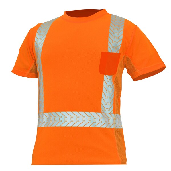 GE ANSI Class 2 Type R Safety Orange Hi-Vis Short Sleeve Shirt Extra Large. This is a GE Orange Hi-Vis Shirt withbirdseye knit polyester fabric, round neck, short sleeve, 2 Premium heat transfer reflective tape, breathable mesh material located on the sides and under arms, one outer chest pocket. Offers UPF 40+ protection. It meets ANSI 107-2020, and it is Class 2 Type R.