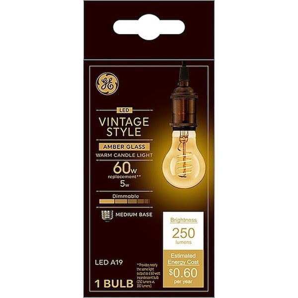 GE Industrial Solutions LED Bulb, General Purpose, Wattage Rating: 5 W, 120 V, Lamp Base: E26, Lamp Shape: A19, Lamp Finish: Amber, Lumens: 250 Lumens, Dimmable, Light Color: Warm White, Color Temperature: 2200 K, Color Rendering Index CRI: 80, Average Life: 15,000 hr, Dimensions: 4.43 in L