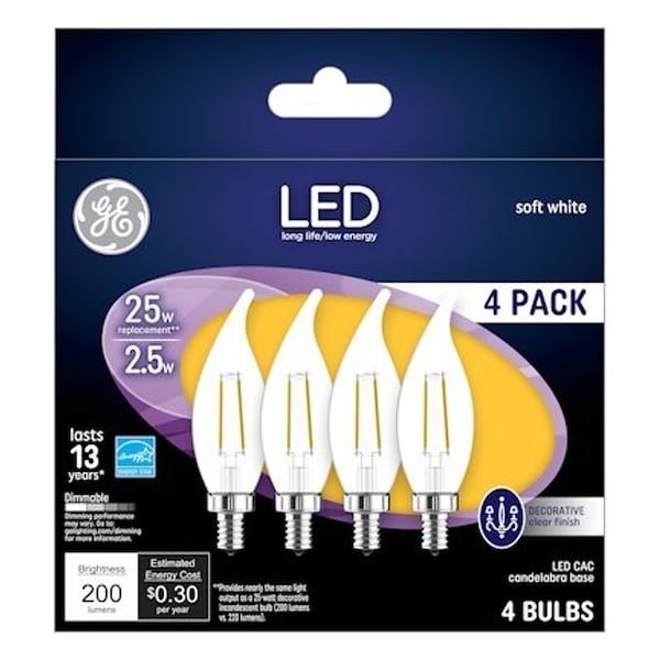 GE LED Bulb, Decorative, Wattage Rating: 2 W, 120 V, 13.7 A, Lamp Shape: CA11, Lumens: 200 Lumens, Dimmable, Light Color: Soft White, Color Temperature: 2700 K, Color Rendering Index CRI: 80, Average Life: 15,000 hr, Beam Angle: 120 deg, Incandescent Equivalent: 25 W, Efficiency: 80 Lumens/W, Suitable for: Fixtures, Indoor Chandeliers and Sconces