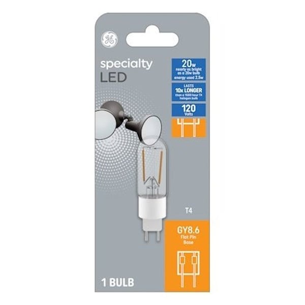 GE LED Bulb, Wattage Rating: 2 W, Lamp Base: GY8.6, Lamp Shape: T4, Lamp Material: Glass, Lamp Finish: Clear, Lumens: 170 Lumens, Light Color: Soft White, Color Temperature: 3000 K, Color Rendering Index CRI: 80, Average Life: 15,000 hr, Incandescent Equivalent: 20 W
