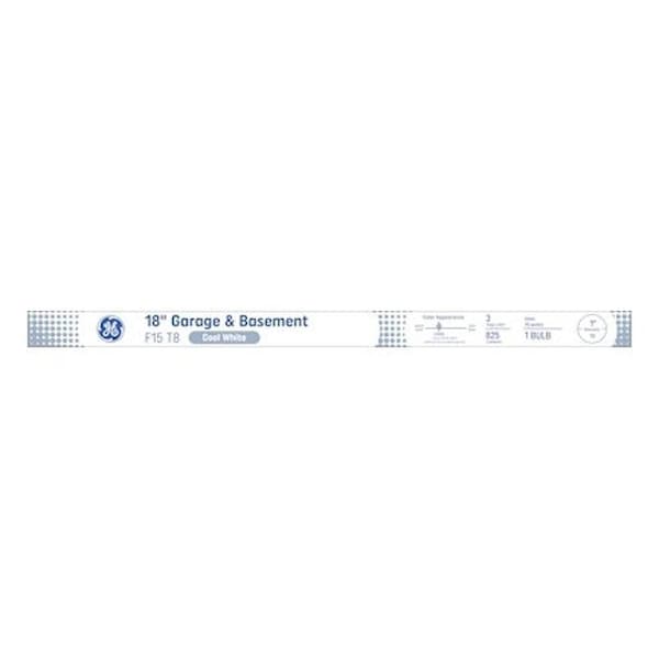 GE Light Bulb, Linear, Wattage Rating: 15 W, Lamp Base: G13 Medium Bi-Pin, Lamp Shape: T8, Lamp Material: Sodalime Glass, Lumens: 825 Lumens, Light Color: Cool White, Color Temperature: 4100 K, Color Rendering Index CRI: 60, Average Life: 7500 hr, Start Type: Rapid, Dimensions: 1 in Dia x 18 in L
