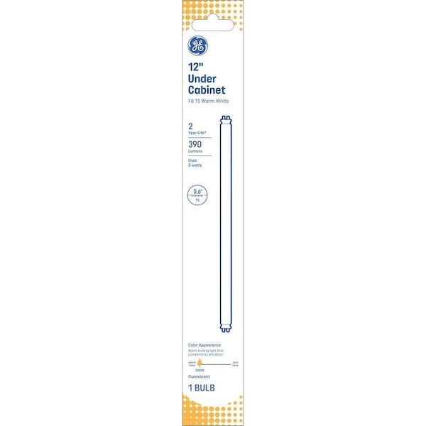 GE Light Bulb, Wattage Rating: 8 W, Lamp Base: G5 Miniature, Lamp Shape: T5, Lamp Material: Sodalime, Lumens: 410 Lumens, Color Temperature: 3000 K, Color Rendering Index CRI: 52, Average Life: 5000 hr, Start Type: Rapid, Dimensions: 0.63 in Dia x 12 in L