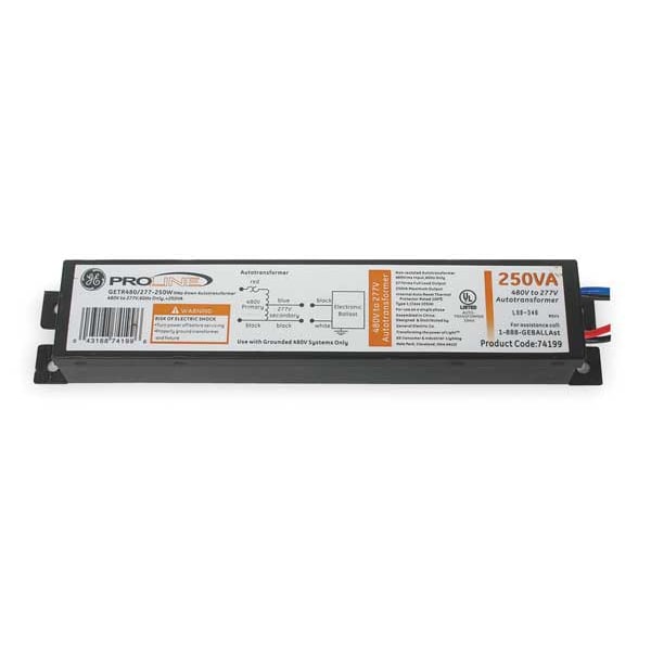 Autotransformer, Input Voltage 480 to 277 V, Output Voltage 277 VAC, Input Power 250 W, Power Output 480/277W, 250 VA Rating, Input Current 0.56 A, Output Current 0.903 A, Ballast Factor 0.85, Power Factor 0.93, Height 1.69 in, Length 9.5 in, Width 1.19 in, Ambient Temp. Range 0 to 50 Degrees C, Min. Starting Temp. -20 Degrees F, Standards UL Listed