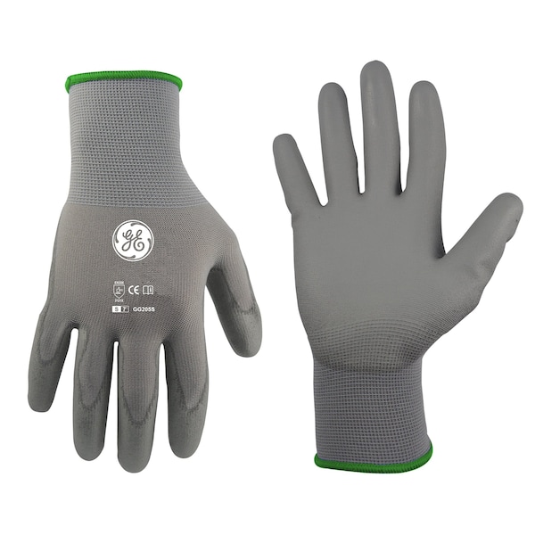 GE Small 15ga Pu Dipped Glove. This is a GE PU Dipped Glove with a 15 Gauge Nylon Liner and a Gray Polyurethane Coating. It is comfortable for the handling of small objects in the workplace. It meets EN388-3121X Standard and has CE certification.