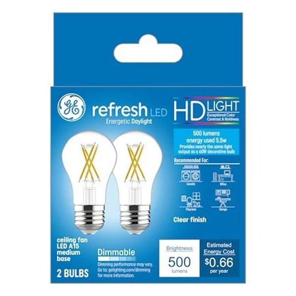 Refresh Series Ceiling Fan Light Bulb, High-Definition, A15 Lamp, 60 W Equivalent, Yes, Clear, PK2