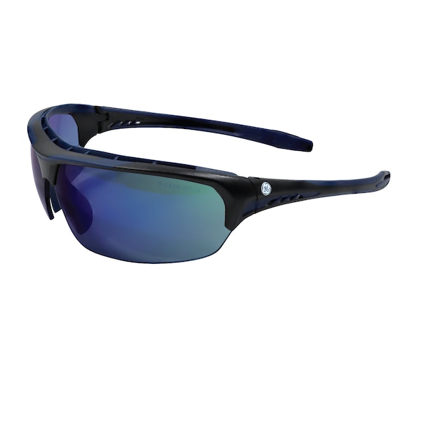 Indigo/Black Half-Frame Safety Glasses with Blue Mirror Anti-Fog Lenses. Features: TPR temples tips, 100% Polycarbonate lens and 8 base curve. TPR vented browguard for comfort and protection with a wraparound design with side protection, vented temples and soft anti-slip TPR nose pads. Meets EN 166, ANSI Z87.1 standard and has CE certification. 99.9% UV Protection