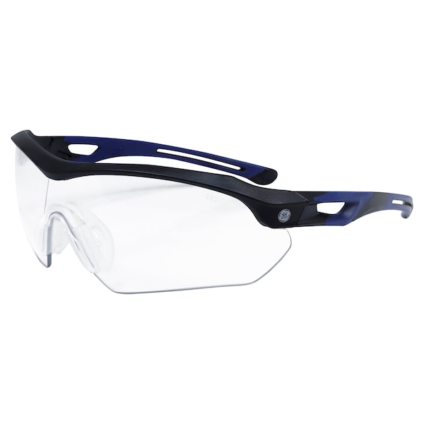 GE Black/Indigo Frame Safety Glasses with Clear Anti-Fog Lenses. This is the GE 10 Series Protective Eyewear with blue antifog lenses. Features: Wrap Around Design with side protection. Anti-Slip TPE Temples. 100% Polycarbonate lens and 7.00 base curve. Lenses provide 100% of UV protection. Built-in Brow Bar for top protection. Anti-Slip Soft TPR Nose Pads. It meets EN 166, ANSI Z87.1 Standard, and has CE certification.