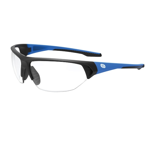 Blue/Black Half-Frame Safety Glasses with Clear Lenses. Features: Anti-slip TPR temple tips, 100% Polycarbonate lens and 9.5 base curve. Sporty style frame with soft, anti-slip nose pads. Meets EN 166, ANSI Z87.1 standard and has CE certification. 99.9% UV Protection