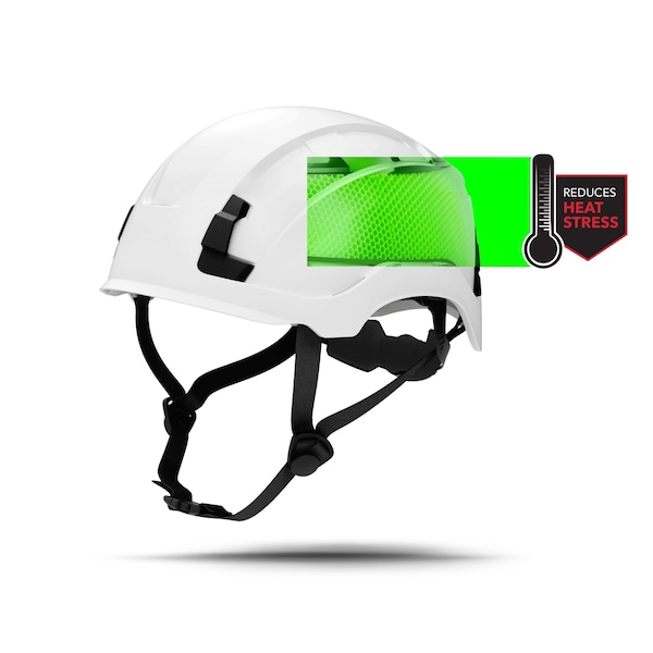 GE White Safety Vented Helmet. This is GE White Safety Vented Helmet made with ABS. Koroyd - Impact Absorbing Material outperforms EPS foam by 48%, preventing energy rebound from the impact onto the user. Ultra-light weight andusable in temperatures from -30DegC to 60DegC. Cross Ventilation System, air flows consistently through the 10 vents, allowing hot air from the head to escape easily. 10 Slots designed to accommodate and securely attach different accessories in the front, rear, and sides. 4-Point Chin Strap made from black polyester, it adapts to earmuff use forbetter comfort. Adjustable Chin Strap providing greater stability and a secure fit. Adjustable Fit System Turning the rubber wheel and moving the system up and down allows the helmet to be adjusted to different head sizes. Integrated Clips designed with 4-point coverage, easy to install. Help secure elastic bands used for goggles and headlamps. Also it Meets ANSI ISEAZ89.1-2014 TYPE 2 CLASS C Standards.