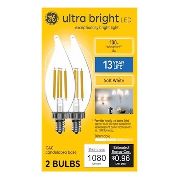 Ultra Bright Series Light Bulb, CA12 Lamp, 100 W Equivalent, E12 Candelabra Lamp Base, Yes, PK2