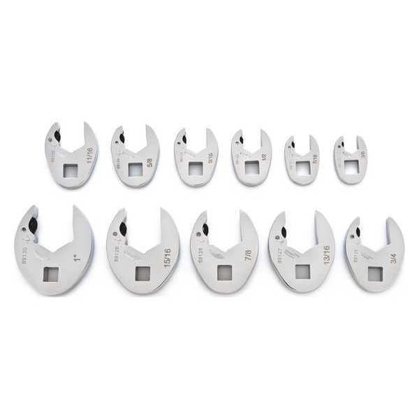 SAE Ratcheting Crowfoot Set,11 Pc, Alloy Steel, Chrome, Drive Size 3/8 in, Range of Head Sizes 3/8 in to 1 in, Number of Tools 11, Blow Mold Case, Number of Points 6, SAE, Rounded