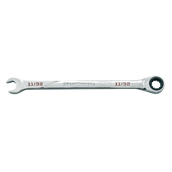 Combination Ratcheting Wrench,11/32 in., Alloy Steel, Chrome, Head Size 11/32 in, Overall Length 6 1/2 in, Head Offset Angle 0 Degrees , Opening Angle (Deg.) 15 Degrees , Standard, Head Thickness 3/16 in, 1/4 in, SAE, Rounded