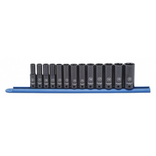 Socket Set, Deep Socket Count/Style (13) 6-Point, Deep Socket Style/Size 10 mm, 11 mm, 12 mm, 13 mm, 14 mm, 15 mm, 16 mm, 17 mm, 18 mm, 19 mm, 21 mm, 9 mm, Deep 6-Point: 8 mm, Impact, Drive Size 3/8 in, Metric, 6-Point, Black Oxide