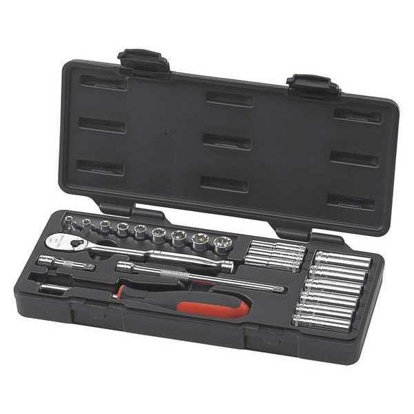 SAE Socket Set,22 pc.,1/4in Drive, Standard Socket Count/Style (9) 12-Point, (9) 6-Point, Standard Socket Style/Size 1/2 in, 1/4 in, 11/32 in, 3/8 in, 5/16 in, 7/16 in, 7/32 in, 9/32 in, Standard 12 Point: 3/16 in, Deep Socket Count/Style (9) 6-Point, Deep Socket Style/Size 1/2 in, 1/4 in, 11/32 in, 3/8 in, 5/16 in, 7/16 in, 7/32 in, 9/32 in, Deep 6 and 12-Point: Deep 6 Point: 3/16 in, SAE, 12-Point, 6-Point