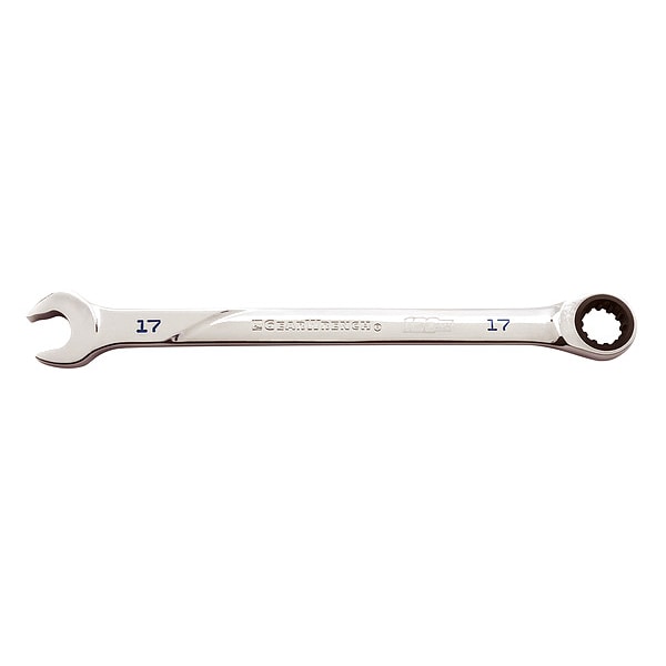Combination Ratcheting Wrench,17mm, Alloy Steel, Chrome, Head Size 17 mm, Overall Length 10 3/4 in, Head Offset Angle 0 Degrees , Opening Angle (Deg.) 15 Degrees , Standard, Head Thickness 5/16 in, 7/16 in, Metric, Rounded