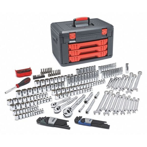 Ratchet Set, Tool Storage Type Tool Box, Measurement Type Metric/SAE, Drive Size 1/4 in; 3/8 in; 1/2 in, Number of Pieces 219, Pliers Included No, Screwdrivers, Keys, and Bits Included Yes, Sockets, Drive Tools, and Accessories Included Yes, Wrenches Included (12) Point Full Polish Long Pattern Combination Wrenches, Striking and Struck Tools Included No, Cutting Tools Included No, Plumbing Tools Included No, Electrical and Telecom Tools Included No, HVAC Tools Included No