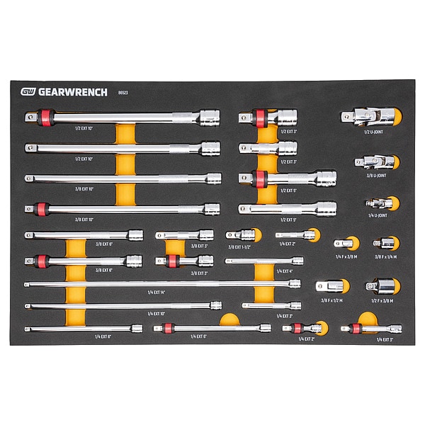 29 Piece 1/4", 3/8", 1/2" Drive Master Chrome Drive Tool Accessories Set with Foam Storage Tray