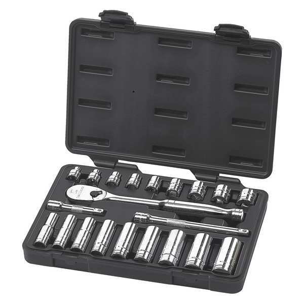SAE Socket Set,21 pc.,3/8in Drive, Standard Socket Count/Style (9) 12-Point, (9) 6-Point, Standard Socket Style/Size 1/2 in, 11/16 in, 3/4 in, 3/8 in, 5/16 in, 5/8 in, 7/16 in, 9/16 in, Standard 6-Point and 12-Point: 1/4 in, Deep Socket Style/Size 1/2 in, 11/16 in, 13/16 in, 3/4 in, 5/8 in, 7/16 in, 7/8 in, 9/16 in, Deep 6 and 12-Point: 3/8 in, SAE, 12-Point, 6-Point