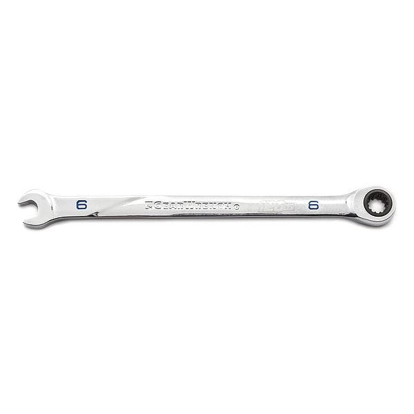 Combination Ratcheting Wrench,6mm, Alloy Steel, Chrome, Head Size 6 mm, Overall Length 5 1/4 in, Head Offset Angle 0 Degrees , Opening Angle (Deg.) 15 Degrees , Standard, Head Thickness 3/16 in, 1/4 in, Metric, Rounded