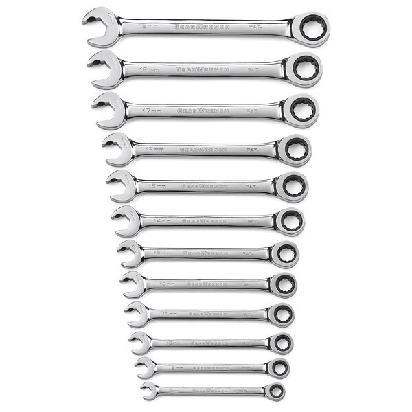 (12) 12 Point Open End Ratcheting Combination Wrenches: 8mm, 9mm, 10mm, 11mm, 12mm, 13mm, 14mm, 15mm, 16mm, 17mm, 18mm, 19mm