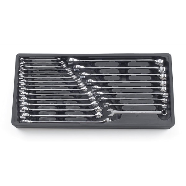 (24) Long Pattern Combination Wrenches: 1/2", 9/16", 5/8", 11/16", 3/4", 13/16", 7/8",15/16", 1", 8mm, 9mm, 10mm, 11mm, 12mm, 13mm, 14mm, 15mm, 16mm, 17mm, 18mm, 19mm, 20mm, 21mm, 22mm; Blow Mold Tray