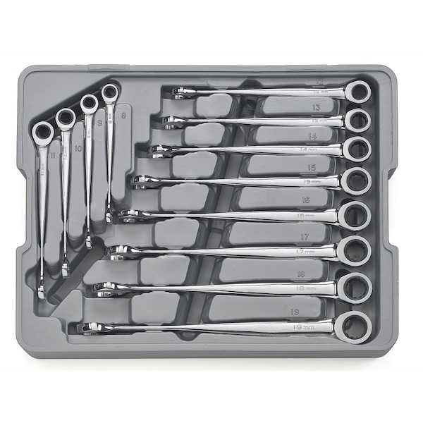 (12) 12 Point XL X-Beam Ratcheting Combination Wrenches: 8mm, 9mm, 10mm, 11mm, 12mm, 13mm, 14mm, 15mm, 16mm, 17mm, 18mm, 19mm; Blow Mold Tray