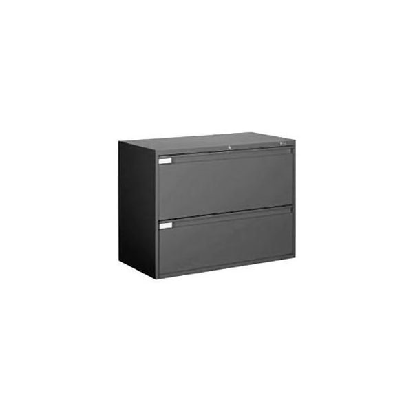 Global 9300 series 36"w 2 drawer binder lateral file - black these premium lateral files measure a generous 18"d and stores large items such as 3-ring binders and 11" x 15" computer print-out binders in an extra large 13-5/16"h top drawer. Bottom drawer is 11-3/16"h that is perfect for legal and letter file folders. Quality features include factory installed folder rails, smooth glide steel ball bearing suspensions and full width drawer pulls. Folder rails in each file drawer allow side-to-side filing; purchase optional front to back bars for convenient front-to-back filing. Central system locks all drawers. Anti-tip feature allows only 1 drawer open at a time. This 27-1/8"h two drawer model fits under work surfaces. Meets ansi/bifma and ista standards.
