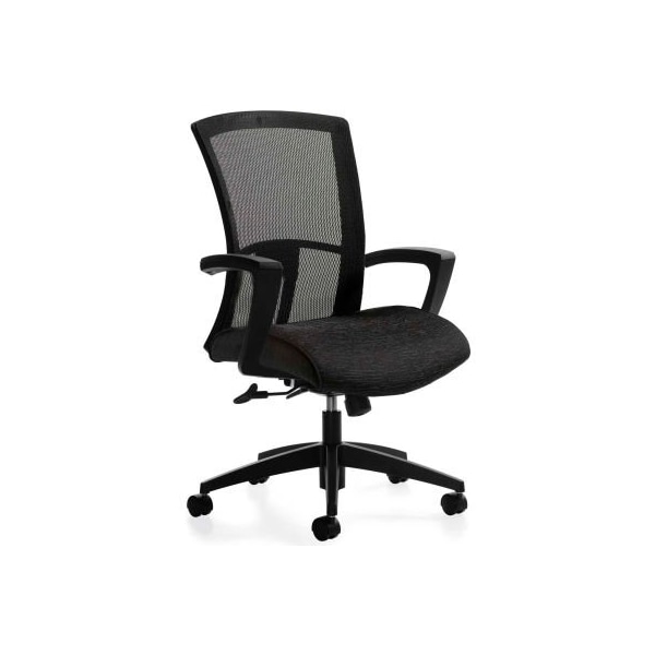 Global vion high back tilter chair with fixed "c" arm with black mesh back & black fabric vion offers a clean transitional design, exceptional comfort adjustments and tremendous value. Two featured arm options include height and width adjusting arms with sliding arm caps, and a stylish fixed urethane arm (c) for conference/management environments. this model can not be cancelled once ordered.