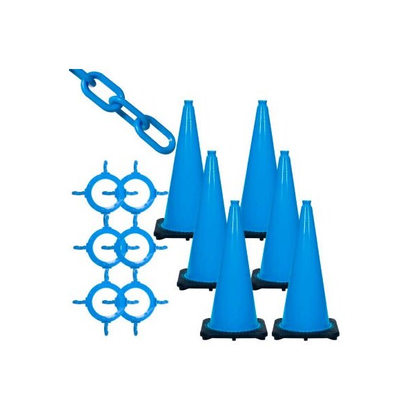 Mr. Chain 93224-6 traffic cone and chain kit, 28 cone height, hdpe/pvc, blue traffic cone and chain kit includes everything you need to create an effective visual barrier to prevent unwanted traffic from entering specific areas. Great for traffic zones, parking lots, construction sites, warehouses, and more. These lightweight and portable traffic cones, cone connectors, and plastic chain are a cost-effective barrier solution. The distinctive visual barrier allows you to block off a larger area with less cones by spacing the cones farther apart. Can be used indoors or outdoors. features: 1. Traffic kit creates an effective visual barrier in pedestrian traffic zones and in work zones 2. Kit complies with osha standards for visual barriers 3. Cone connectors and plastic chain are constructed from high-density polyethylene with uv inhibitors to protect them from fading 4. Includes six 28-inch traffic cones that are injection-molded pvc with 14 x 14-inch bases weighing 7 pounds 5. Includes 6 chain connectors and 50 feet of 2-inch plastic chain