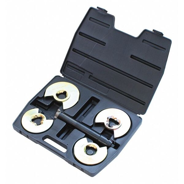Coil Spring Compressor, Tool Type Coil Spring Compressor, Application Safely Remove and Install Coil Springs, Material Steel, Overall Length 10 3/8 in, Drive Size 19 mm, Size 1, 2, Includes (2) Pressure Plates, Base Body, Plastic Storage Case