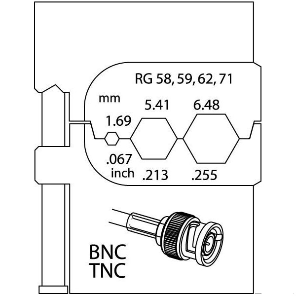 Cable Diameter: 1.69, 5.41, 6.48mm/0.067, 0.213, 0.255 Inch; Connector Type: RG 58, 59, 62, 71