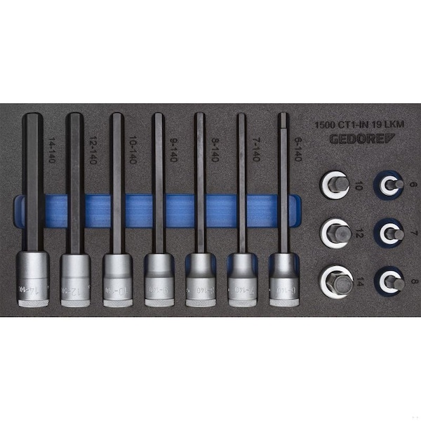 (9) 1/2" Drive Hex Bit Sockets: 5mm, 6mm, 7mm, 8mm, 9mm, 10mm, 12mm, 14mm, 17mm; (3) 1/2" Drive Hex Bit Sockets 90mm Length: 5mm, 6mm, 8mm; (3) 1/2" Drive Hex Bit Sockets 140mm Length: 10mm, 12mm, 14mm