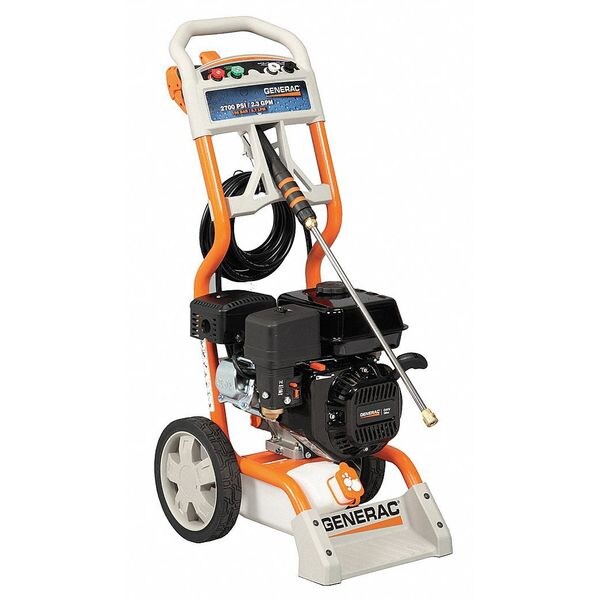 Pressure Washer, Medium Duty (2000 to 2799 psi), 2700 psi, Gas, Pressure Washer Water Type Cold, Pressure Washer Style Cart, Pressure Washer Flow Rate 2.3 gpm, Engine Brand Generac, Starter Type Recoil, Engine Displacement 196cc, Detergent Injection System Yes, Pump Type Axial Cam, Pump Drive Direct, Usable Hours per Week 0 to 10, Hose Dimensions 1/4 In. x 25 ft., Burner Fuel Gasoline, Includes High-Pressure Hose, Wand, Gun, (4) Quick-Connect Nozzles