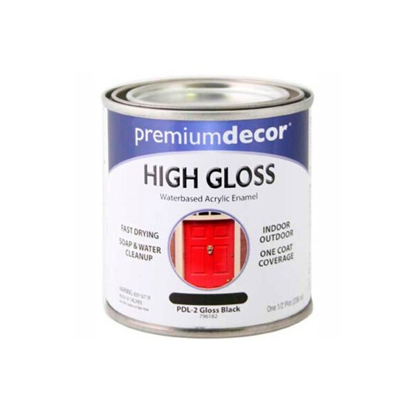 Premium dcor waterborne acrylic enamel, gloss finish, black, 1/2 pint - 796182 premium dcor water-based acrylic enamel is a superior brush-on enamel for both indoor and outdoor use. Provides fast drying, one coat coverage. Soap and water clean-up. Indoor or outdoor furniture, primed wood or primed metal, wood trim and crafts. Not recommended for use as a house paint.