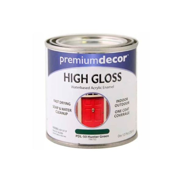 Premium dcor waterborne acrylic enamel, gloss finish, hunter green, 1/2 pint - 796752 premium dcor water-based acrylic enamel is a superior brush-on enamel for both indoor and outdoor use. Provides fast drying, one coat coverage. Soap and water clean-up. Indoor or outdoor furniture, primed wood or primed metal, wood trim and crafts. Not recommended for use as a house paint.