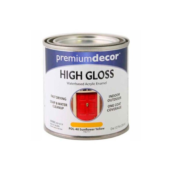 Premium dcor waterborne acrylic enamel, gloss finish, sunflower yellow, 1/2 pint - 796717 premium dcor water-based acrylic enamel is a superior brush-on enamel for both indoor and outdoor use. Provides fast drying, one coat coverage. Soap and water clean-up. Indoor or outdoor furniture, primed wood or primed metal, wood trim and crafts. Not recommended for use as a house paint.