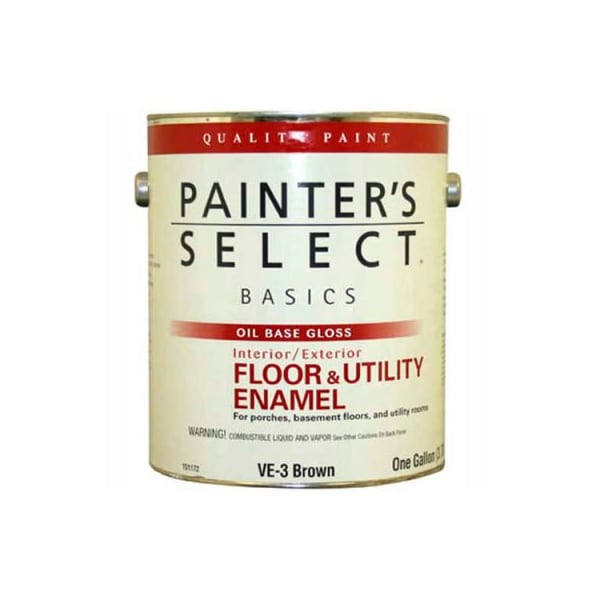 Painter's select basics floor & utility enamel, gloss finish, brown, gallon - 151172 painter's select basics floor & utility enamel is a good quality, economical floor paint. Ideal for use on floors, railings, and hard use areas. Abrasion resistant. Easy to clean high-gloss finish. All interior and exterior wood, concrete and primed metal. Use on porches, basement floors, patios, utility rooms and other surfaces where a wear resistant coating is needed such as locker rooms, factories, schools and furniture.