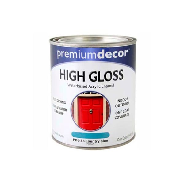 Premium dcor waterborne acrylic enamel, gloss finish, country blue, quart - 796667 premium dcor water-based acrylic enamel is a superior brush-on enamel for both indoor and outdoor use. Provides fast drying, one coat coverage. Soap and water clean-up. Indoor or outdoor furniture, primed wood or primed metal, wood trim and crafts. Not recommended for use as a house paint.