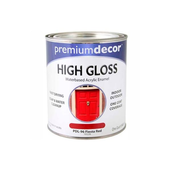 Premium dcor waterborne acrylic enamel, gloss finish, fiesta red, quart - 705226 premium dcor water-based acrylic enamel is a superior brush-on enamel for both indoor and outdoor use. Provides fast drying, one coat coverage. Soap and water clean-up. Indoor or outdoor furniture, primed wood or primed metal, wood trim and crafts. Not recommended for use as a house paint.