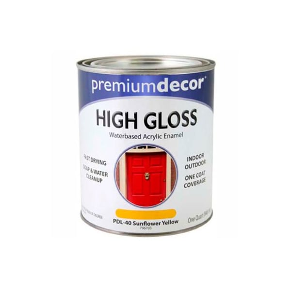 Premium dcor waterborne acrylic enamel, gloss finish, sunflower yellow, quart - 796703 premium dcor water-based acrylic enamel is a superior brush-on enamel for both indoor and outdoor use. Provides fast drying, one coat coverage. Soap and water clean-up. Indoor or outdoor furniture, primed wood or primed metal, wood trim and crafts. Not recommended for use as a house paint.
